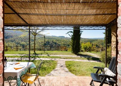 All’esterno veranda ombreggiata con tavolo, sedie e sdraio che si affaccia sulla splendida vallata circondata da alberi e natura.